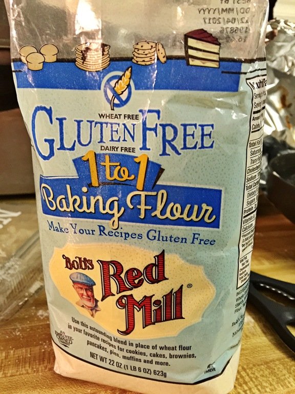 - 2.25 cups 1 to 1 Bob's Red Mill 1 to 1 baking flour or Gluten Free baking flour