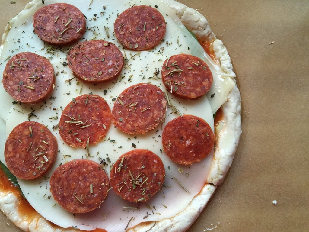Heat oven to 425. I have a baking steel so I can put my stove up to 500. Roll out dough, top with pizza sauce and desired toppings. Bake for 10-12 minutes at 425, or 8-10 minutes at 500.