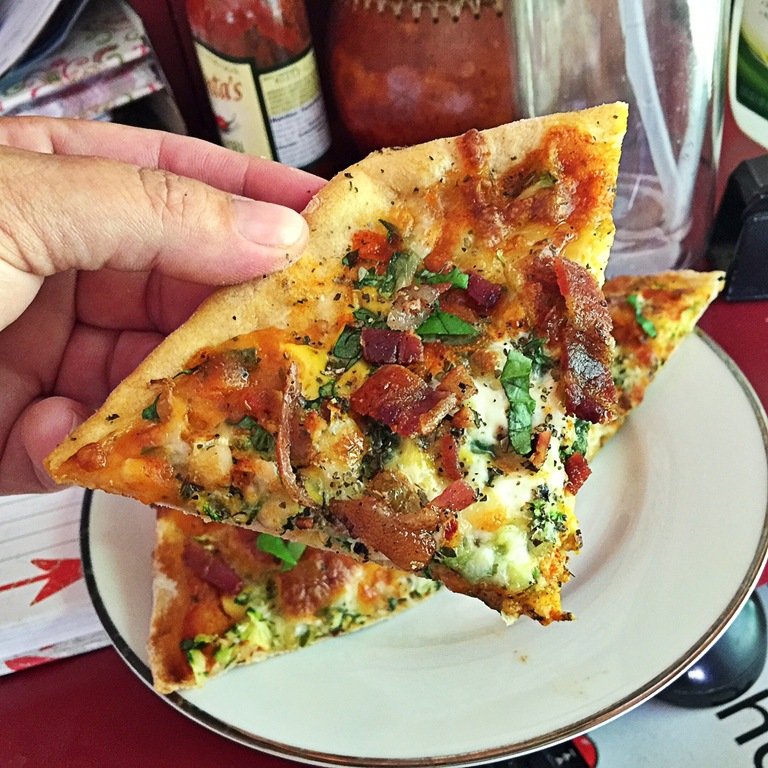 It was another market day yesterday, and I was really hungry the day before so decided to have a bigger breakfast. As luck would have it, I still had pizza dough in my fridge – on about day 10 which is about as long as I can go without it getting all slimy. I actually prefer the dough to be days old before I use it – gives it so much more flavor. Yesterday’s breakfast pizza: 3 ounces pizza dough (8) shaved Brussels sprouts, zucchini and spinach with an ounce of part skim mozzarella cheese (2) and one egg (2) with a piece of chopped bacon (1). 13 smart points was spent on breakfast, but this was super filling.