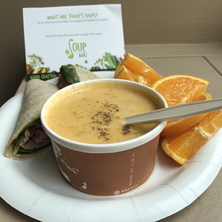 I got together with my sister and our friend Jenny for our walk. We call ourselves the “Walk Stars” and our 45 minute walk goes by in a flash with all our talking. As we were walking I saw this soup place – Soup Barz on Wells. I had a roast beef low carb wrap and an orange and needed to accessorize my lunch. And you all know what a soup whore I am!