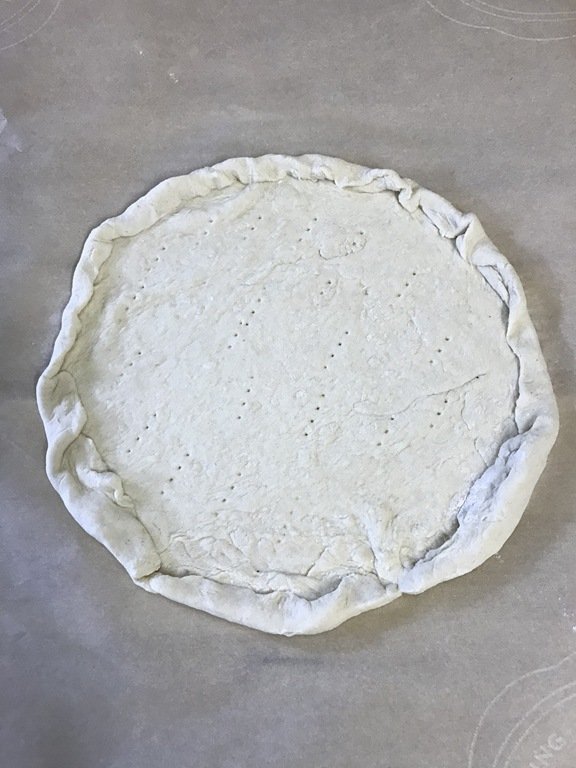 I bake my pizza on my baking steel, but even if you use a cookie sheet, use parchment paper because you’ll be able to transfer your pizza in and out of the oven so much easier.  I dock the dough, meaning I stick a fork in the dough so I don’t get any big dough bubbles on the pizza.