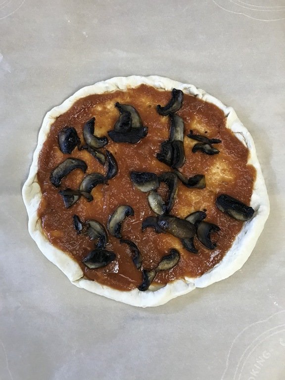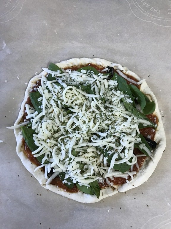 Heat oven to 425.  I have a baking steel so I can put my stove up to 500.  Roll out dough, top with pizza sauce and desired toppings.  Bake for 10-12 minutes at 425, or 8-10 minutes at 500.