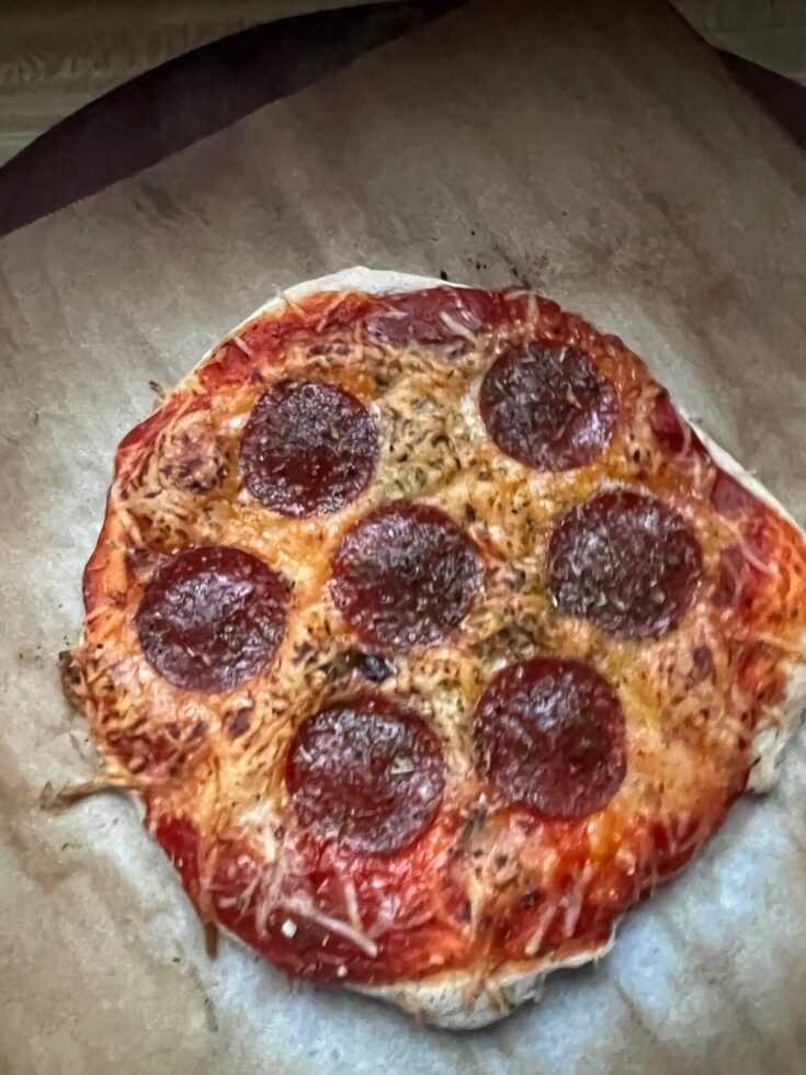 In the below photo, I tried baking on a regular baking sheet at 425 for 15 minutes.  I pre-heated the baking sheet for 20 minutes before placing my pizza on the hot baking sheet, and I got a nice crispy crust! Plenty of people have said that their baking sheets can be preheated at 500 degrees, but start with 425 and see what works for you with your baking sheet and oven.  If it’s not crispy at 425 degrees, bump up the temp in 25 degree increments.