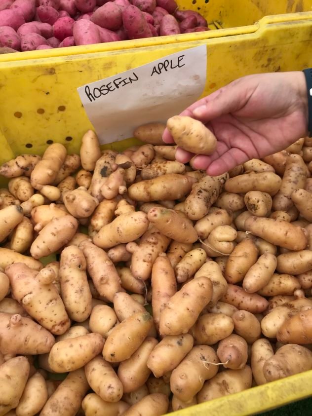 I’ve never heard of this variety of potato before, but I love fingerling potatoes, so I picked up about half a pound for $2. After a quick google search, these are “chef” potatoes because they have a buttery flavor.