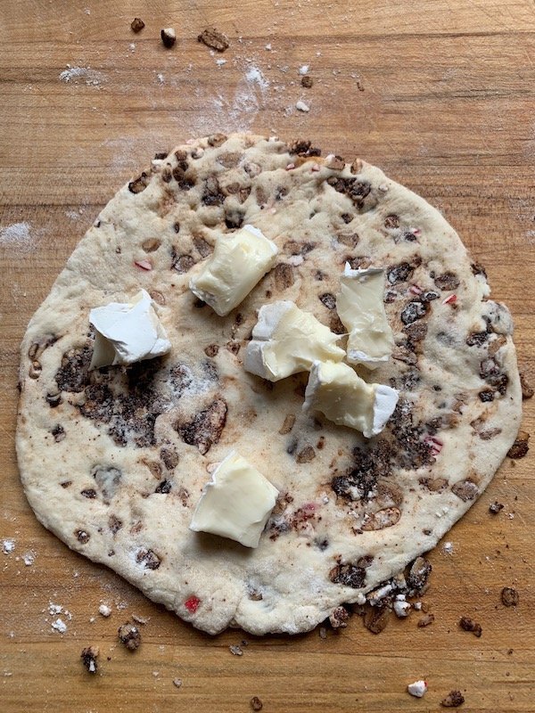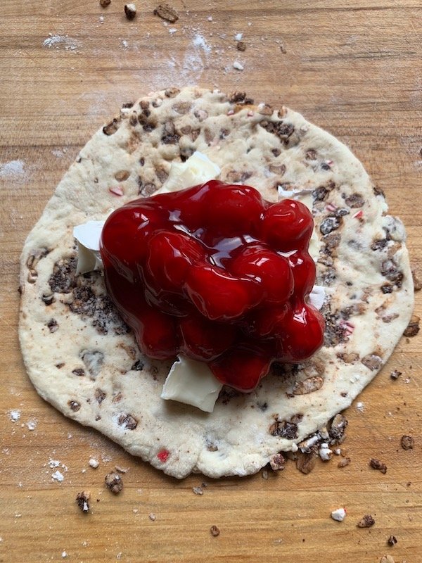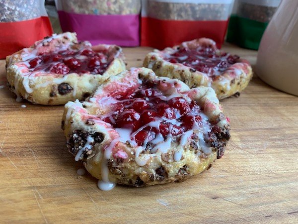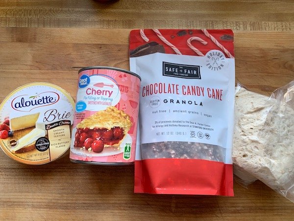 These are my version of a grown up Hostess cherry pie – made with the Safe + Fair Candy Cane granola kneaded into the danish dough, filled with brie and no sugar added cherry pie filling. Then finished off with a glaze. It’s delicious. You don’t get the candy cane in every bite, so it’s a nice surprise when you get that bite. The slightly saltiness of the brie mixed with sweet/tart cherry pie filling. Well, let’s just say I am glad I only made three otherwise I’d eat a dozen.
