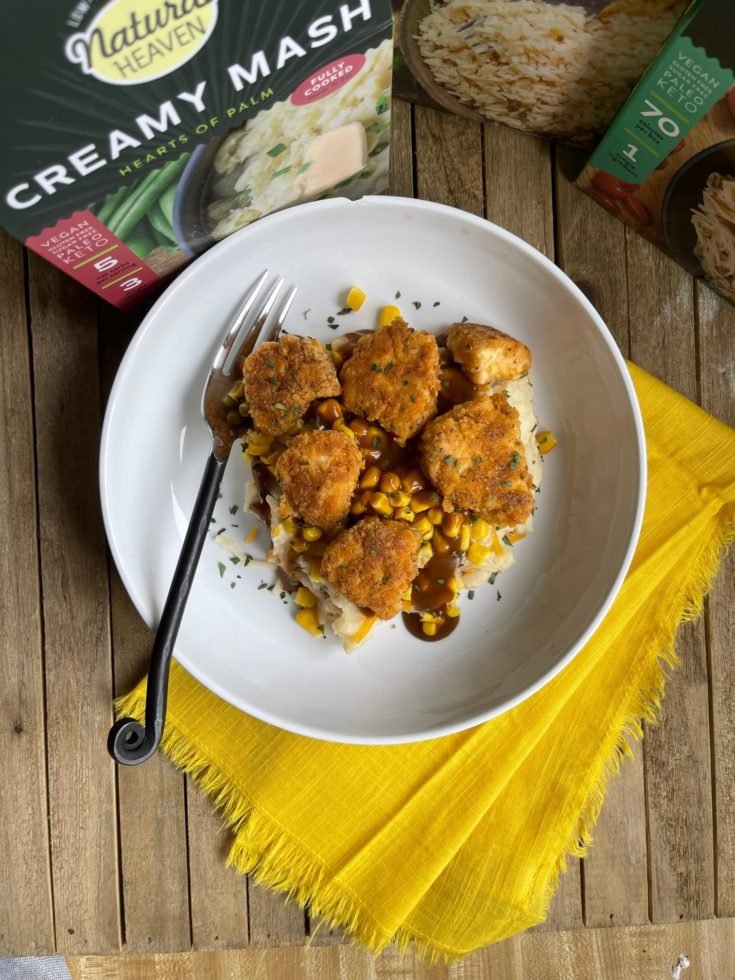 To plate: put the mashed potatoes on the bottom, top with the corn (that you can just reheat in the microwave for 30 seconds), cheese and gravy, and top with the cooked chicken.