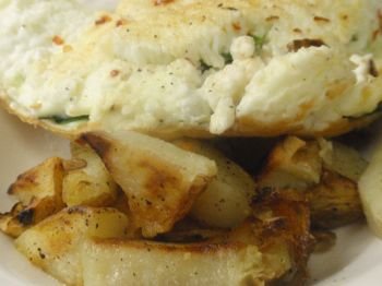 - In the same skillet, add the egg whites. Cook until nearly set, then add the spinach, sesonings and feta cheese. Fold over, and put a lid on for the last minute to cook through. Serve with the potatoes and fruit of choice on the side.