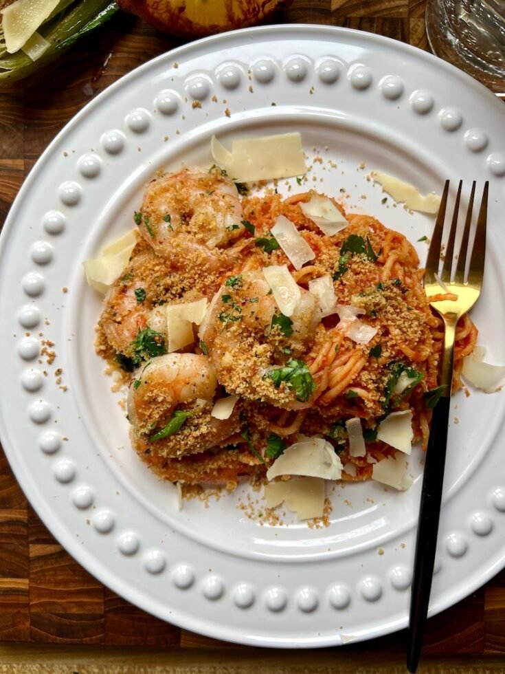 Serve: Transfer the garlic shrimp pasta to serving plates or a large serving dish. Sprinkle the toasted bread crumbs over the top of the pasta for added texture and flavor. Finally, garnish with shaved Parmesan cheese for an extra savory touch.