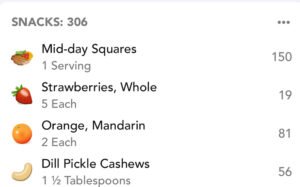 Monday: 29 WW Points – 1181 calories, 38.5 fat, 171 carbs, 27 fiber, 50 grams of protein {28% fat, 56% carbs, 16% protein}