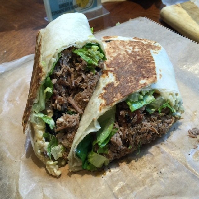 We each got the Pilsen Wrap – slow cooked beef, black beans, cheddar cheese, avocado, romaine lettuce, green salsa with a chipotle and cilantro crema.