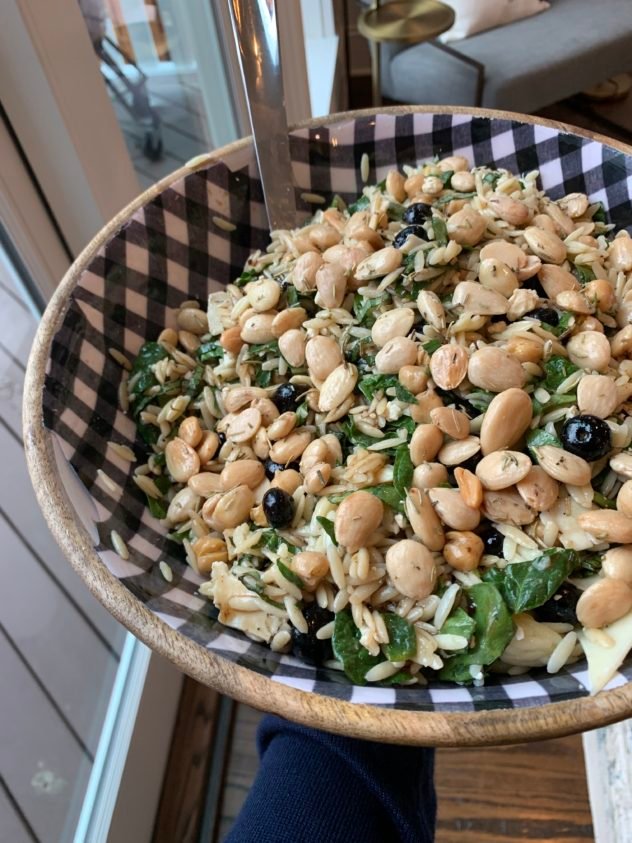 I made an orzo pasta salad with fresh basil, spinach, blueberries, feta cheese, shaved pecorino romano cheese with rosemary marcona almonds.