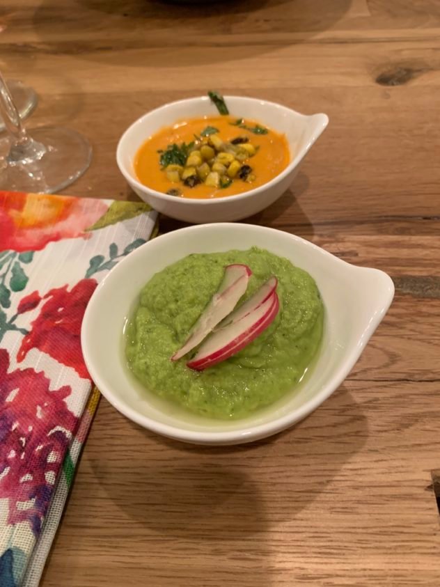 Julie made a duo of vegan chilled soups. First was a carrot and ginger soup with charred corn and jalapeno with fresh herbs. The other was an asparagus and avocado soup with radish. If I could have licked those bowls, I would have!