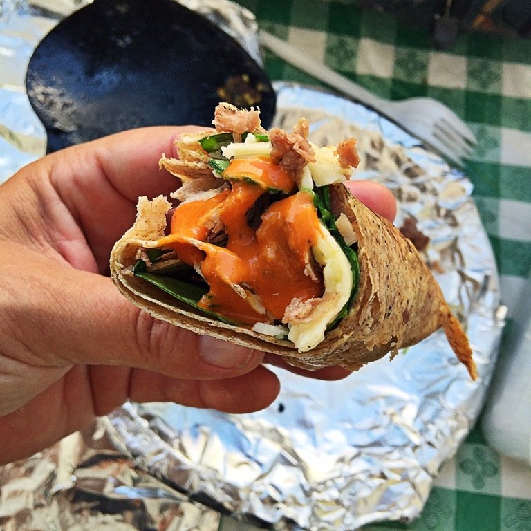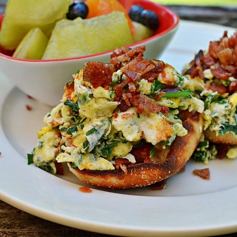 Breakfast was a Bay’s sourdough English muffin (I puffy heart these! – 4 points) an egg/egg white spinach scramble (2) with 1/2 ounce Cabot cheese (2) and topped with chopped crisp bacon (2).