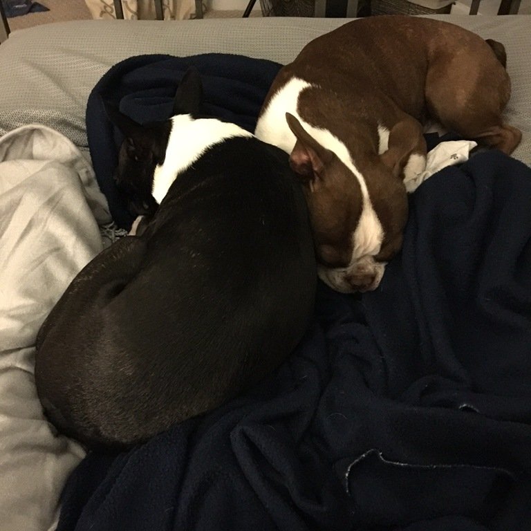 The dogs have been sleeping with me the last few nights and it’s so cute.  Although they start out all cute and cuddly like this, before I know it Rummy is all stretched out on one side of the bed.  The last two mornings I’ve woken up to 1/4 of the bed and the dogs have taken over the other 3/4 of the bed.