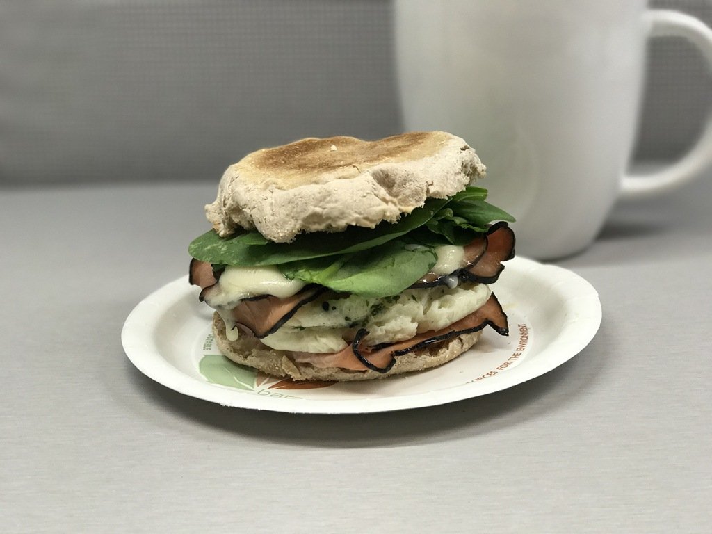 I didn’t eat breakfast until nearly 10! An oldie but a good, light English muffin (2), egg whites (1), deli ham (1), and 1/2 ounce provolone (2).
