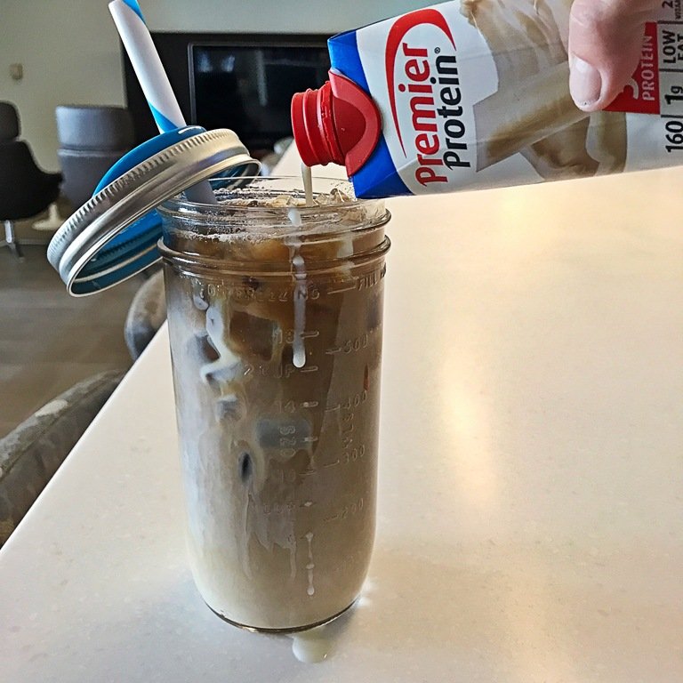 I had Day 8 of Insanity when I got home, and since I had to stay 30 minutes late and wouldn’t be eating dinner until 8:00 or 8:30, made a vanilla Premier Protein iced coffee drink. I poured myself a cup of coffee around 3:00 and just let it get to room temp and drank this at 5:15. Um, turns out trying to take a picture and pouring proved to be a bit difficult!
