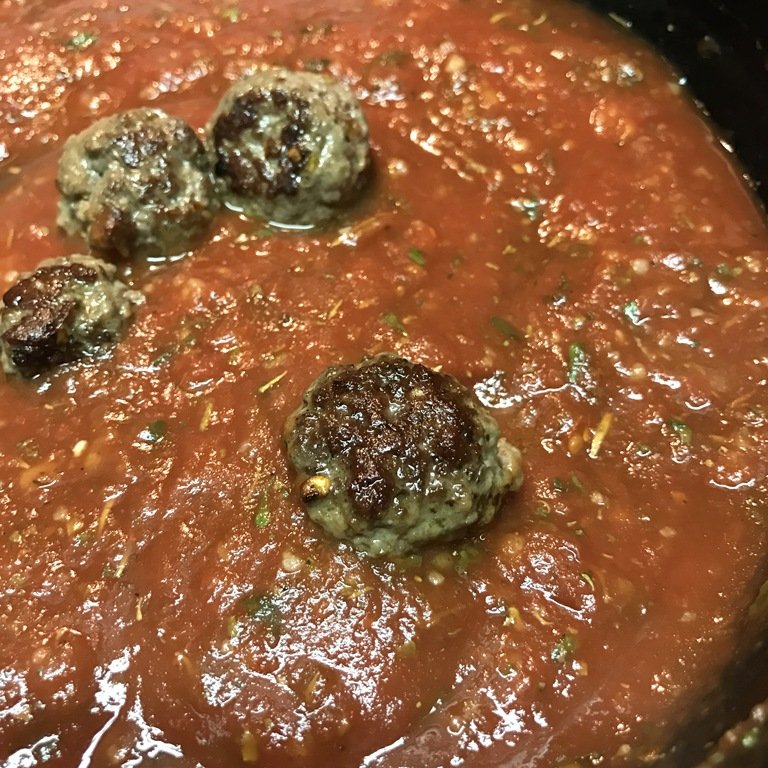 I was still able to get a nice sear and the balls before throwing them in the sauce to finish cooking. These were tiny balls (sometimes tiny balls are okay!) so they didn’t need to simmer too long before being cooked through.