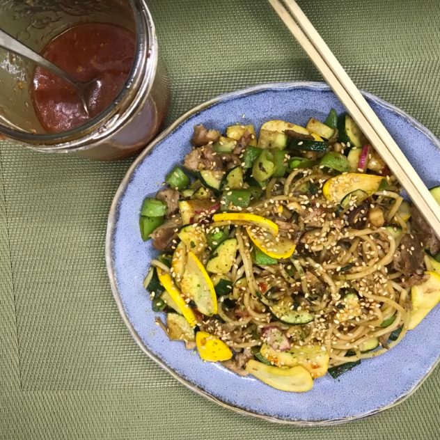 Hannah put an order in at Walmart to pick up after work last night – but there was a computer glitch and her order didn’t get placed.  They managed to scrape up something to eat with leftovers, as did I.  My friend Jacky gave me some of her Korean BBQ sauce – holy balls is it delicious!  Spicy, sweet, hint of lemongrass.  I decided because I had that sauce I would make a leftover pork rib lo mein.  The base of my sauce was 1 teaspoon teriyaki sauce, 1 teaspoon hoisin sauce, 1 teaspoon rice vinegar and 1 teaspoon sambal oelek.  I finished the lo mein with a drizzle of Jacky’s sauce – so good!  I literally picked through all the vegetables I had on hand to make this dinner.  I am definitely hitting up the farmers market at lunch today.