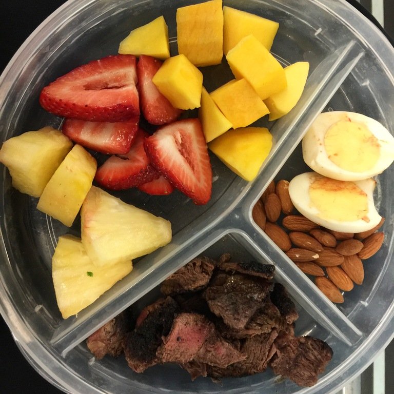 While I felt a bit awkward eating this plate of food on the train ride to work yesterday morning, what I did love was that I didn’t feel rushed eating my breakfast like I do when I am sitting at my desk and work keeps piling up around me.  Three ounces leftover beef (well, really not leftover I cooked it before I left the house so it was still warm!) (3) 100 calorie pack of almonds (3) a hard boiled egg (2) and lots of fresh fruit.  But sadly between the three of us, we already ate all the mango!