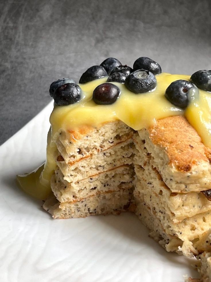 this is a photo of poppy seed pancakes with lemon curd
