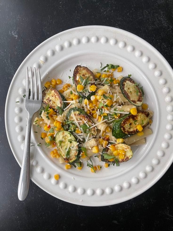 - To plate: Place pasta on the plate, top with the charred zucchini and corn and garnish with parsley and a bit more Parmesan cheese.
