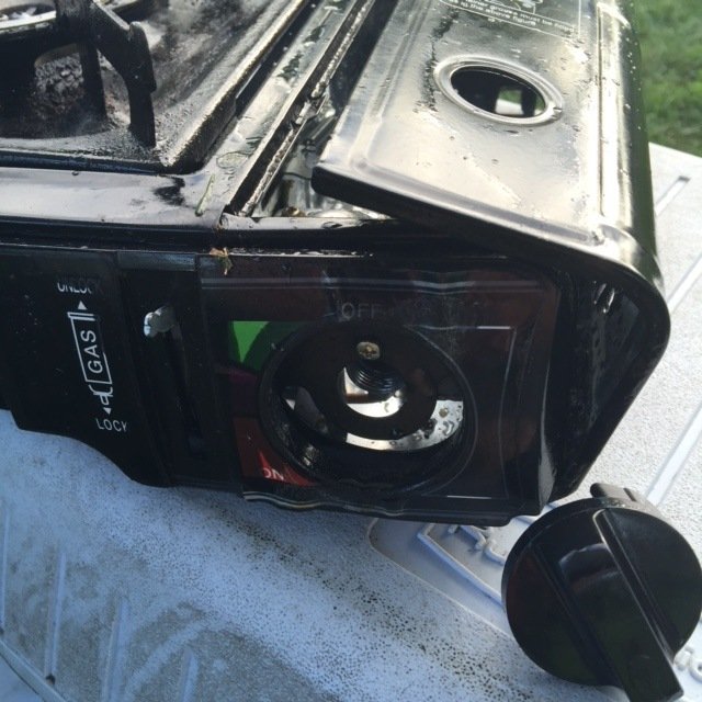 And as I was setting up the burners, I turned the third burner on, when all of a sudden the temperature handle popped off, and I had propane on fire shooting up in the air about six feet. It all happened so fast and my only thought was “don’t burn the tent down!” I took my spatula, pushed the burner onto the ground and then got my water sanitation container and put the fire out.